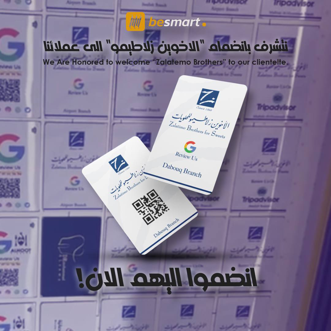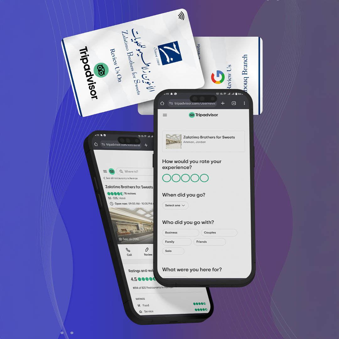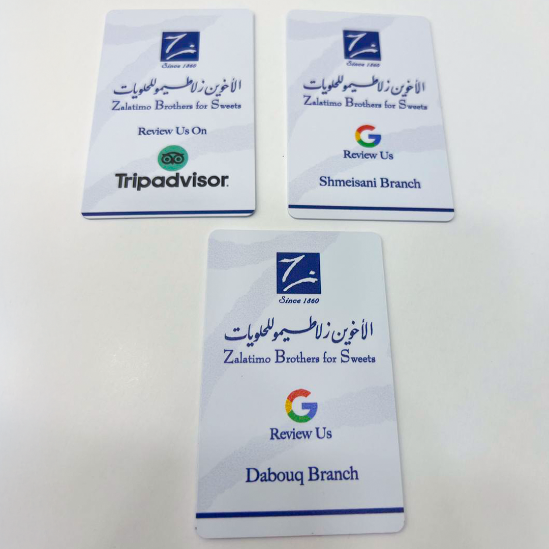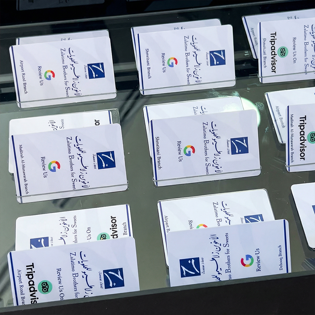 Touch-enabled Google Review Cards (NFC), designed and delivered to more than 15 branches across Jordan and Saudi Arabia.